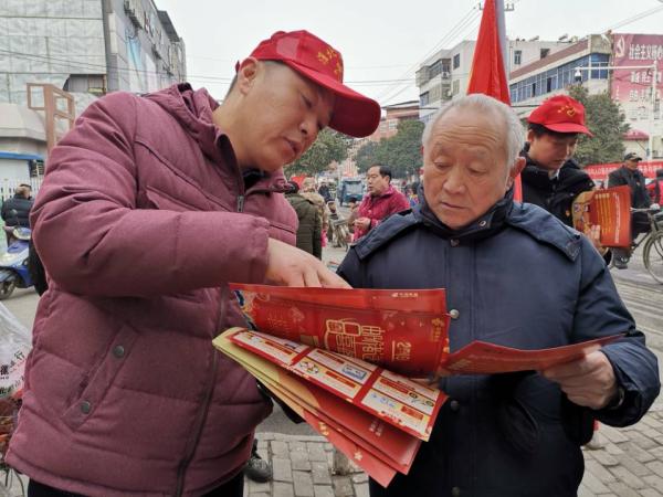 近一段时间以来,淮北市分公司认真开展“党旗领航 聚力发展”主题实践活动。图为 1月18日,该分公司机关党支部组织10余名党员赴联系点杨庄支局开展帮扶工作,党员同志到人流密集处宣传邮政服务。
