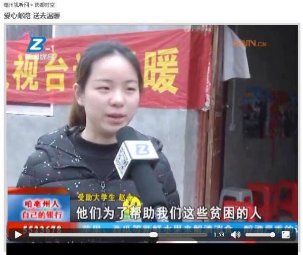 “真得非常感激他们,我无以回报,只能好好学习,毕业之后尽自己所能回报社会。”2月2日上午,亳州市谯城区十八里镇张庄村困难大学生赵令,面对亳州市广播电视台记者的采访,热泪盈眶感激亳州市分公司多年来对其的帮助。