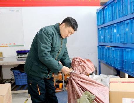 5分钟后,揽收车开进了一家童鞋仓库。车刚停稳,杨龙便打开后备厢取出一个邮袋,急匆匆地乘电梯来到二楼的发货仓。放眼望去,宽大的货仓里整齐摆放着一排排货架,上面堆满了货物,三五个工作人员在忙碌地封装包裹。“这两筐都是今天要发走的。”顺着声音,只见杨龙已经麻利地扫码处理包裹了。“这些是发往北京的,要专门挑出来过安检,加盖发验章,‘两会’期间要保证寄递安全。”从事揽投工作4年,杨龙已经把安全意识牢牢记在了心上。不到十分钟时间,129件包裹全部装进了邮车。