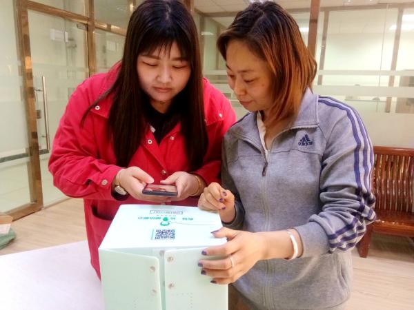 和县寄递事业部员工向客户推荐周转箱,指导客户扫码填写寄件信息。