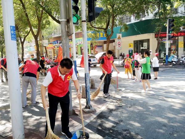 7月30日,安庆市分公司党员志愿者与社区志愿者联合行动,帮助打扫街道杂物、落叶,并清洁栏杆,清理“牛皮癣”,为美化城市做贡献。(孙超 摄)