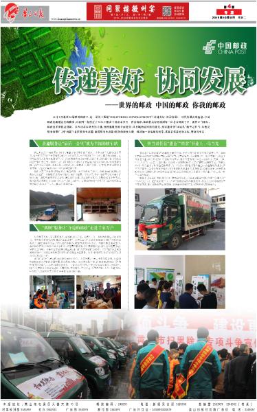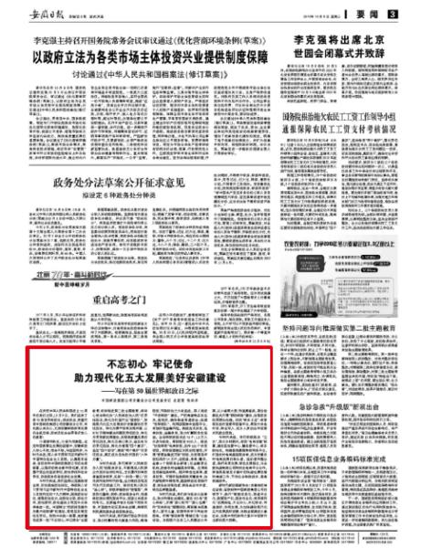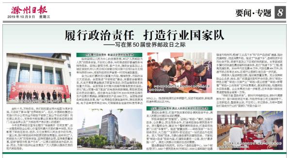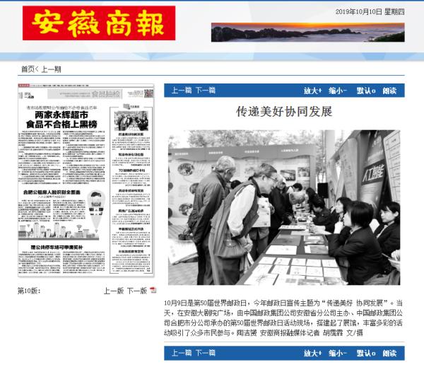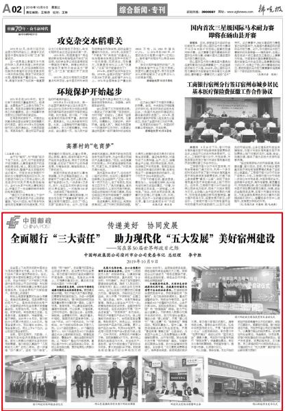 《安徽日报》10月9日第3版刊发省分公司党组书记、总经理陈洪涛《不忘初心 牢记使命 助力现代化五大发展美好安徽建设》的署名文章。文章从与时代共进,我们坚持以党建统领全局,切实提高政治站;与时代共进,我们秉承“人民邮政为人民”的服务宗旨,不断满足人民群众对美好生活的向往;与时代共进,我们践行国企责任担当,助力打赢防范化解重大风险、精准脱贫、污染防治三大攻坚战;与时代共进,我们参与社会公益事业,助力和谐社会建设;与时代共进,我们积极服务“三农”,助力乡村振兴等五个方面,全面系统介绍了70年来安徽邮政人初心不改、使命不移,与祖国同步,与时代共进,切实履行国企的经济责任、政治责任和社会责任,发挥邮政优势,积极服务我省经济社会发展所取得的成绩。