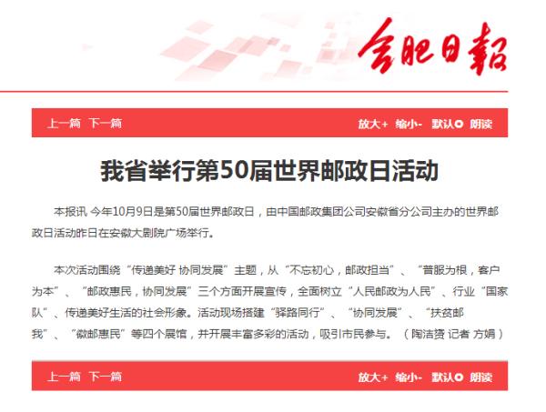 世界邮政日期间,《安徽日报》等省、市级党报纷纷在重要版面刊发文章,宣传邮政发展成绩和担当“人民邮政为人民”初心使命的作为。一些地方媒体和新媒体平台还对各地邮政的活动予以报道,刊载主题宣传海报,营造出浓厚的庆祝氛围。