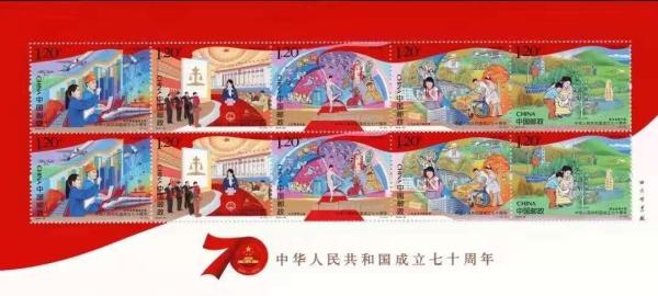 为庆祝中华人民共和国成立70周年,中国邮政于2019年10月1日发行《中华人民共和国成立七十周年》纪念邮票1套5枚,小型张1枚。展示祖国在经济、政治、文化、社会、生态文明等方面取得的巨大成就。邮票图案名称分别为:经济持续健康发展、社会主义民主政治推进、文化繁荣兴盛、人民生活不断改善、建设美丽中国,小型张图案名称为:祝福祖国。