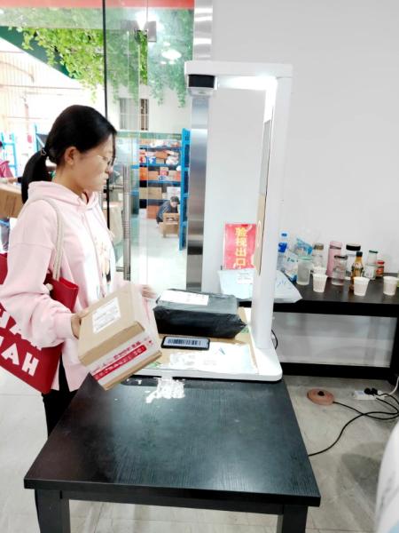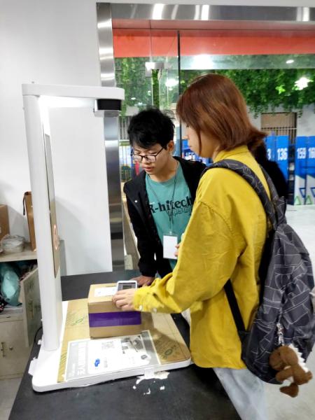 11:30,该中心迎来了“双11”后的第一个取件高峰。眼见取件的同学越来越多,人工通道应接不暇,该中心负责人黄健健高声喊到:“后面排队的同学可以去左门的无人自助通道,那边有高拍仪,支持自助取件。”循声望去,左门出口两侧各摆放了一台高拍仪,打开支付宝扫描高拍仪上的二维码,将手机上出现的身份码和快件同时放入高拍仪的镜头下,10秒取件成功。半个小时左右,学生顺利取件超千件。