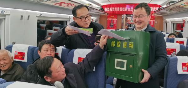 高铁站志愿者还带着邮戳和临时邮箱,在列车上为乘客服务。