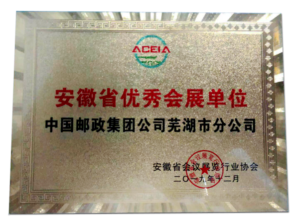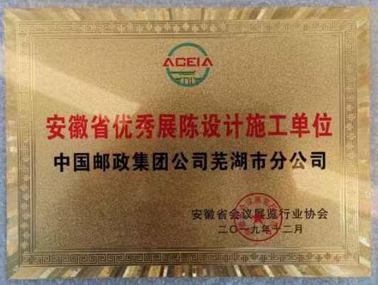 2019年12月26日,在安徽省会展行业协会举办的2020安徽·合肥会展行业年度盛典上,芜湖市邮政分公司荣获安徽省优秀会展单位以及安徽省优秀展陈设计施工单位两个省级奖项。