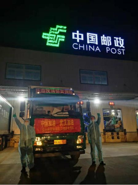 傍晚,方伟、张军和邮区中心局的员工抓紧将防疫和捐赠物资装车。每装一箱,方伟和张军的心里都踏实一点,虽然人还在安庆,但是心早已飞到了湖北。8吨的邮政运输车在大家的齐心协力下,很快达到了“满负荷”。“国家有需要,邮政在行动”“中国加油 武汉加油”鲜红色的横幅披挂上车。在闪亮的“中国邮政”标识牌下,方伟和张军竖起了大拇指,来了一张自豪的合影。“出发,前进!”带着同事们的加油鼓劲声,满载的邮政运输车在暮色中坚定启动,飞驰湖北。