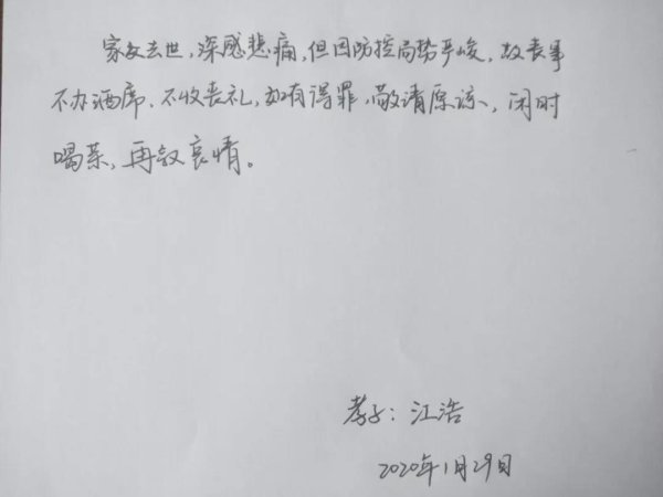 “家父去世,深感悲痛,但因防控局势严峻,故丧事不办酒席,不收丧礼,如有得罪,敬请原谅,闲时喝茶,再叙哀情。”1月29日,油坊店乡邮政所投递员江浩77岁的父亲去世,一家人经过商议,江浩决定不办丧事,并在家门口醒目位置贴出了告知书。