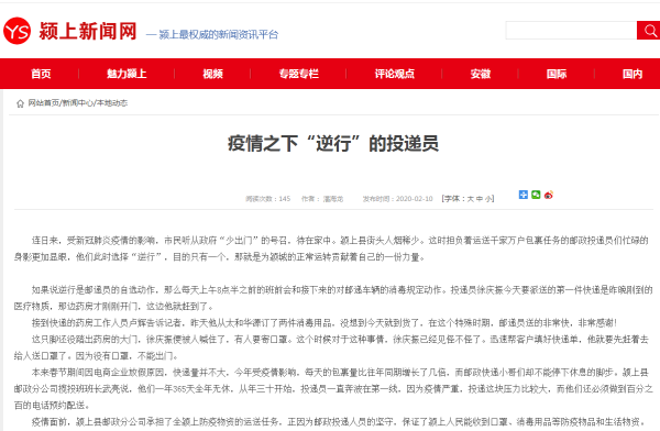2月10、11日,颍上县广播电视台、颍上新闻网、颍上县融媒体抖音号等报媒体以《疫情之下“逆行”的投递员》为题,报道了疫情期间,颍上邮政的投递员们身体力行,勇担使命,为保障医疗物资及时运送、千家万户方便收到快递"逆行"的事迹。