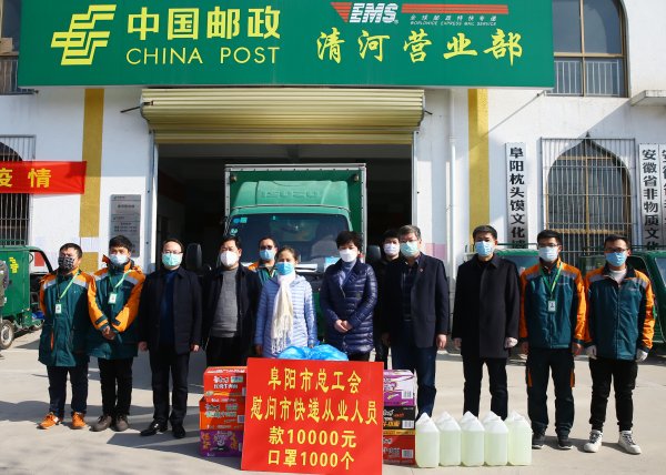 2月12日下午,阜阳市总工会党组书记、副主席房继红,阜阳市邮政管理局局长张冬梅,阜阳市快递协会会长吕万峰一行,来到阜阳市分公司清河营业部慰问投递人员,送去方便面、水果以及口罩、消毒液等物品,向坚守岗位的邮政职工致以亲切的关怀和问候。