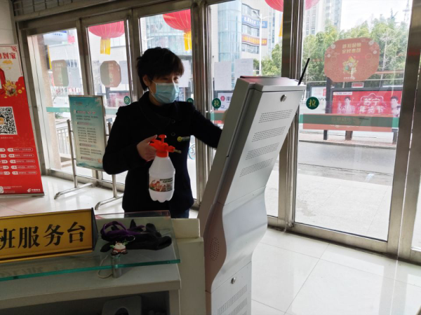 “隔壁就是第三人民医院,我们不能有丝毫侥幸,疫情防控措施能不能严格落实,直接关系着网点员工和客户的生命安全。”每天晨会上,曹王伟都要向员工反复叮嘱。网点严格按照营业前、营业中和营业后三个频次开展消毒,对客户按照门前、厅内、柜面“三道防线”落实防护措施。