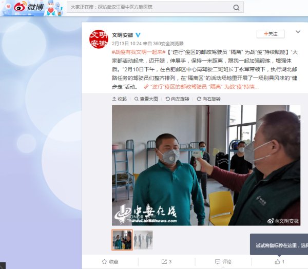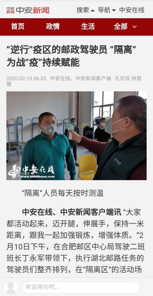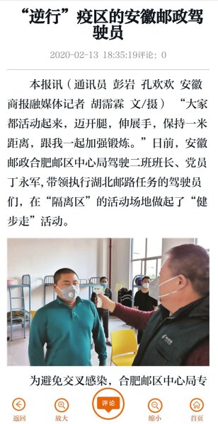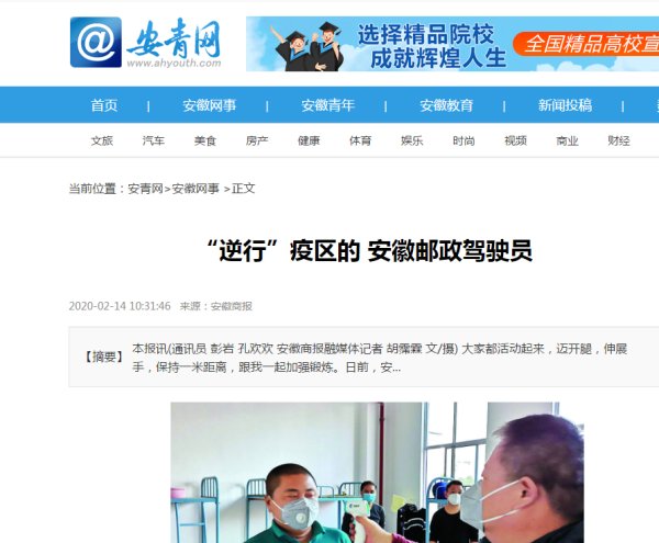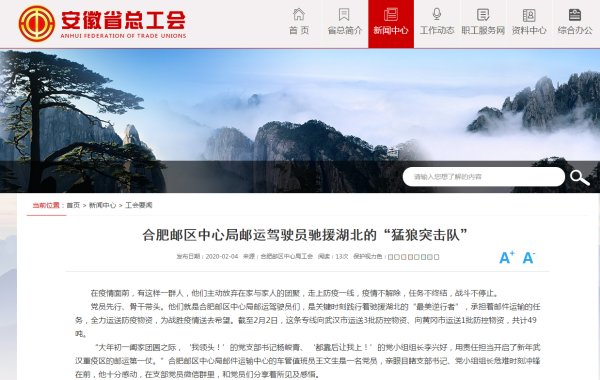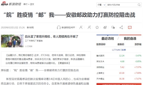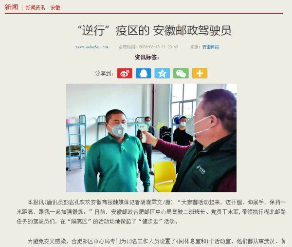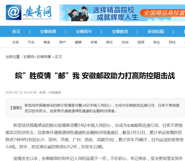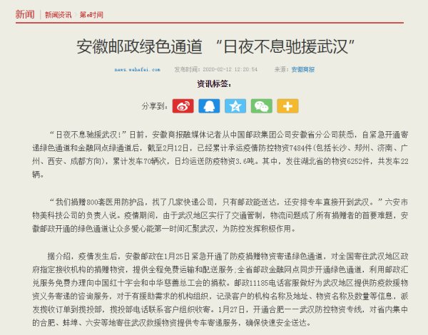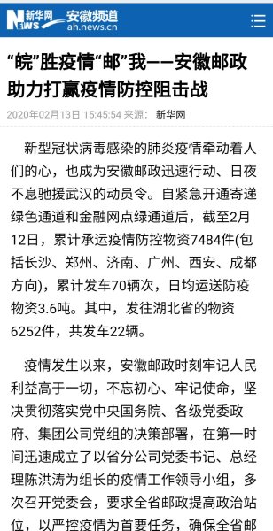 新冠肺炎疫情发生以来,我省邮政全力做好疫情防控工作,开通专线抢运救援物资驰援武汉、黄冈,受到多家媒体关注。近日,新华网、新浪财经、东方资讯、安徽商报、中安在线、文明安徽、安青网、安徽省总工会网站、合肥网等媒体报道了我省助力打赢疫情防控阻击战、邮政员工“逆行”的新闻。