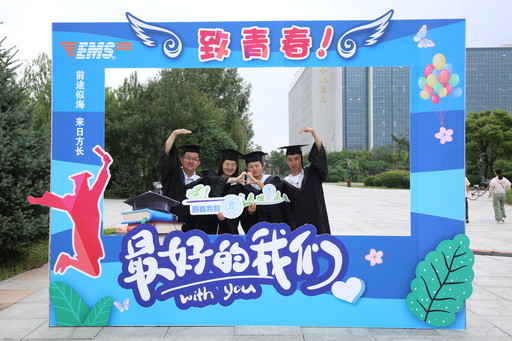 7月12日,内蒙古邮政分公司与内蒙古财经大学首次合作,在校园内为毕业生量身打造了毕业邮局,设计展出了独具内蒙古特色的“青春不散场”蓝色蒙古包相框、充满青春活力的“致青春·最好的我们”抖音版式相框。穿着学士服的毕业生流连其间,纷纷摄影打卡留念,保存一份美好的青春回忆。图为毕业生在“致青春·最好的我们”的相框中合影。 □记者 王圆圆 通讯员 陈婧 摄影报道
