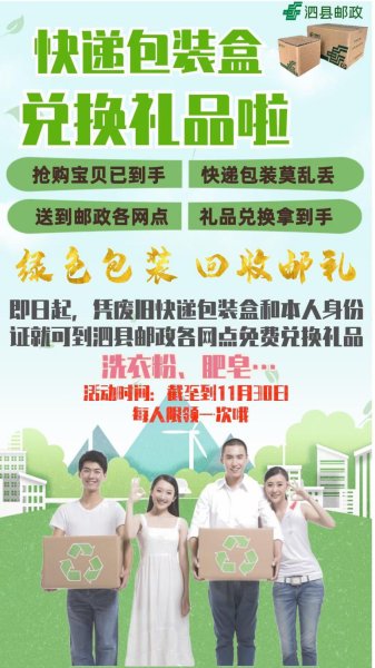 “你知道吗?现在带上快递废旧包装盒和本人身份证到泗县邮政网点能免费领洗衣液啦。”“双11”期间,借助绿色邮政宣传月的契机,泗县分公司推出“绿色包装、回收邮礼”快递废旧包装盒回收活动,凭快递包装盒和本人身份证到邮政网点可兑换洗衣液或者肥皂,倡议大家爱护环境、循环利用。截至目前,累计兑换废旧包装盒568个,收寄包裹143单,新增金融资产180万元。