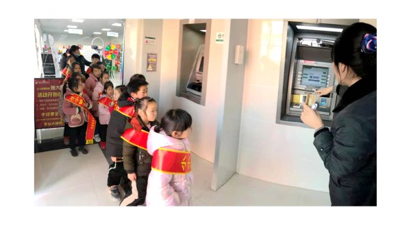 活动当天,山头支局理财经理带小朋友们参观、熟悉支局的工作区域,通过通俗易懂的语言、生动形象的讲解,让小朋友认识自助机具等新型银行设备,教会他们掌握简单的操作方法,并带领他们现场体验了业务办理流程。