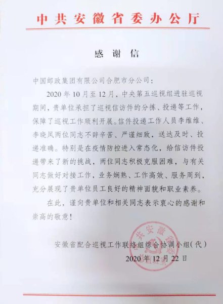 2020年12月22日, 中共安徽省委办公厅致信合肥市邮政分公司,感谢投递员李维维和李晓凤。