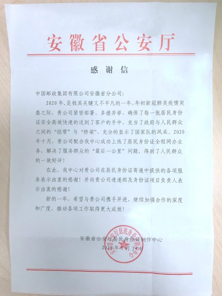 近日,省分公司收到省公安厅居民身份证制作中心寄来的感谢信。信中表示,安徽邮政配合公安部门成功上线居民身份证全程网办业务,解决了服务群众的“最后一公里”问题,得到了人民群众的一致好评。信中称赞安徽邮政在新冠肺炎疫情突袭之际,紧密部署、多措并举,确保了每一张居民身份证安全、高效、快速地送到客户的手中,建起了政府与人民群众之间的“纽带”与“桥梁”,充分显示了行业“国家队”的风采。