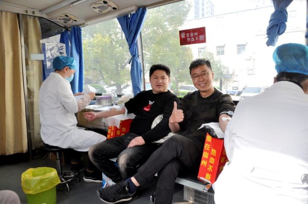 各部门员工积极响应,早上9点,就在一楼院内等候宿州市中心血站的献血车。他们中有工作多年的党员干部,也有初入职场的青年员工。