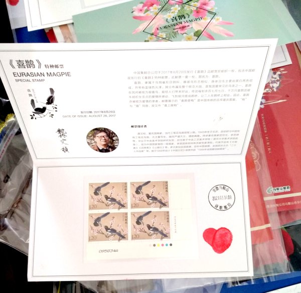 在这个特殊的日子,马鞍山邮政为新人赠送的爱情邮折名为“喜鹊登梅”,寓意“喜事登门”,给予新人满满的祝福。同时,由新人双方共同按上爱心手印,盖上当日的邮戳,非常契合新人“爱你一生一世”的美好愿望。