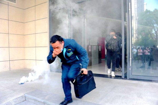 培训结束后,进行火灾逃生演练。虽然能见度很低,但是大家并没有慌乱,顺着楼梯扶手有序下楼,不到一分钟时间全部安全撤离。