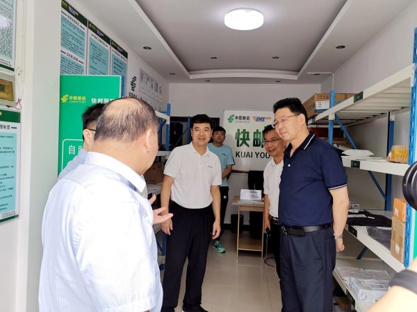 在世纪名流快邮驿站,周东明拿起包裹详细了解投递情况,对驿站的布局表示肯定,鼓励邮政利用快邮驿站社区客户微信群,开展本地农产品社区团购活动,利用线上下单,站点自提的方式,从源头将本地农产品配送至客户手中。