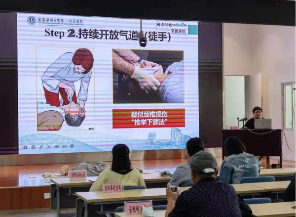 专家深入浅出地讲解了心肺复苏的现场救护知识,以及徒手心肺复苏术的胸外心脏按压、开放气道、人工呼吸的方法。为了让大家更加清楚地了解心肺复苏,授课现场还精心准备了心肺复苏人体模型,由医务人员示范并指导参加讲座的志愿人员进行现场实战模拟。
