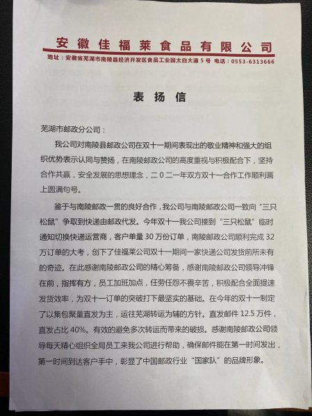 近日,南陵县邮政分公司收到合作伙伴安徽佳福莱食品有限公司的表扬信:南陵县邮政分公司冲锋在前,指挥有方,员工加班加点,任劳任怨不畏辛苦,顺利完成了32万订单的大考,创下了佳福莱公司“双11”期间一家快递公司发货前所未有的奇迹……