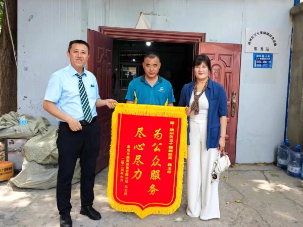 近日,阜阳市鑫海运输有限公司负责人马云侠,顶着烈日来到三十铺邮政支局,亲自向投递员韩玉标送上一面“为公众服务 尽心尽力”的锦旗,表达感谢之情。