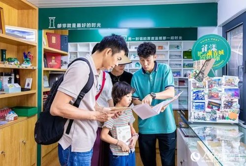 6月18日,来自福建的游客在呼和浩特市玉泉区塞上老街旅游休闲街区“塞上主题邮局”内参观、选购。