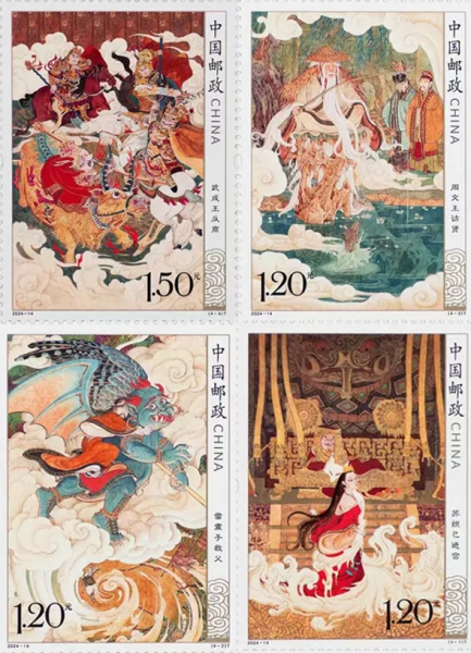 本次发行的《封神演义(一)》特种邮票,1套4枚,小型张1枚。邮票采用中国传统工笔重彩方式创作,画面继承了宋画的美学意蕴,笔法精细、构图精密,营造出神秘古远、浑厚磅礴的史诗般的奇异化境。