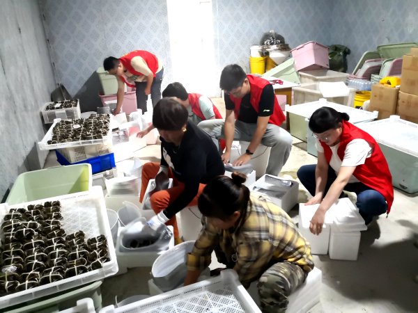 志愿者们在明光市嘉乡蟹湾农业实践基地,为服务乡村振兴重点企业——健源生态农业有限公司,提供螃蟹捆扎、打包、装箱、搬运等志愿服务。