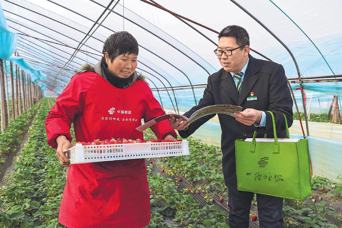 眼下正是草莓上市的关键时期,湖北省襄阳市邮政分公司主动做好“三农”服务,聚焦草莓产业链发展,联合当地邮储银行提供惠农贷款、销售、寄递等一条龙服务,并于日前启动草莓同城配送项目,规划生鲜寄递专门运输线路,助力特色农业产业发展壮大。图为3月5日,襄阳邮政工作人员走进大棚,向种植户宣讲邮政服务举措。
