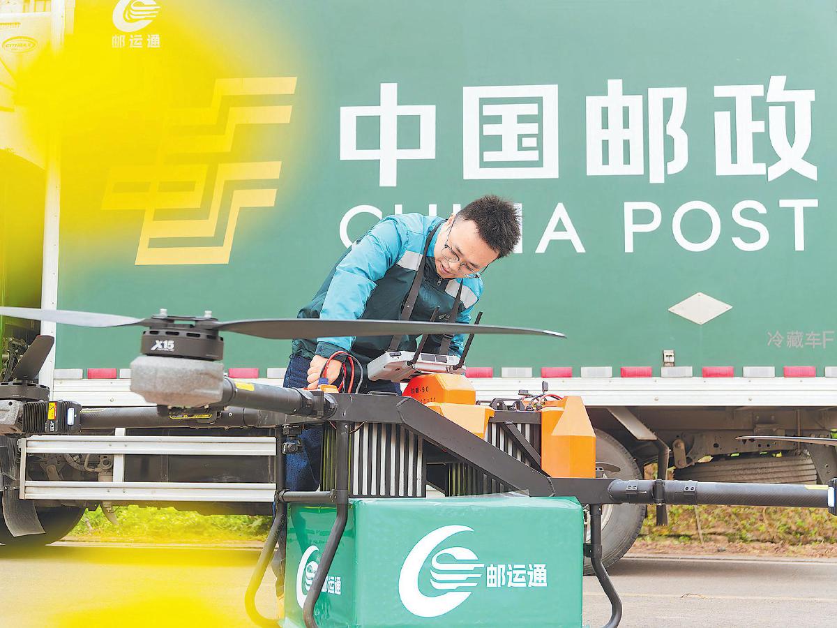 3月13日,重庆邮政飞控员在检查无人机,保障农资精准送达田间地头。 □王金庄 摄